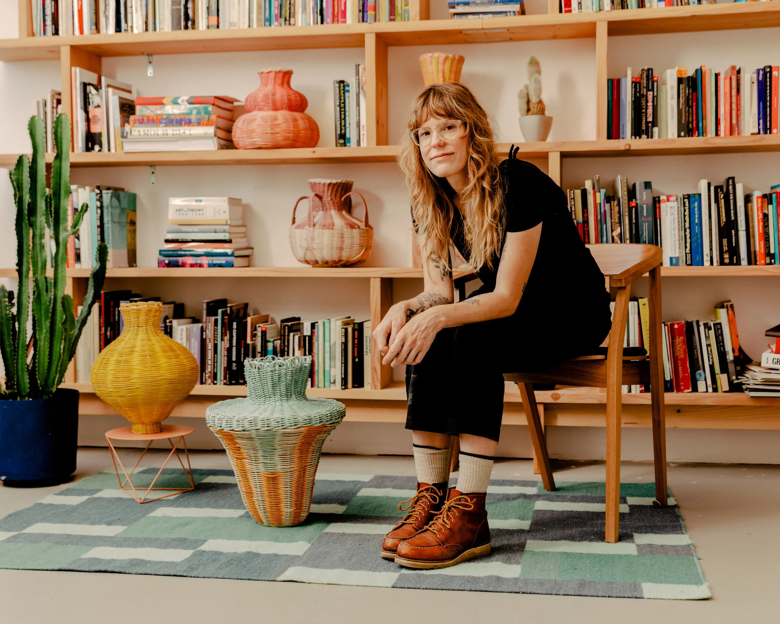 The founder and director of Studio Herron, Dee Clements, is not one to shy away from the craft roots that inform her design practice. The avid researcher has traveled the world learning about the ethnography of objects and craft disciplines through a feminist lens, ultimately leading her to basketry. Although guided by a deep appreciation for materials and respect for traditional methodologies, especially those historically stewarded by women, the designer wants basket weaving to run wild. She zigzags between tight and loose weaves, often intentionally leaving the structures unfinished to create abstract sculptural forms at a grand scale. Painterly surfaces built through multicolor hand-dyed reeds and gouache heighten the freedom of form.